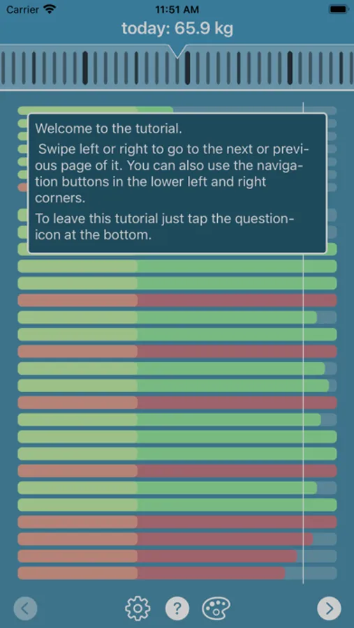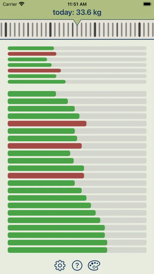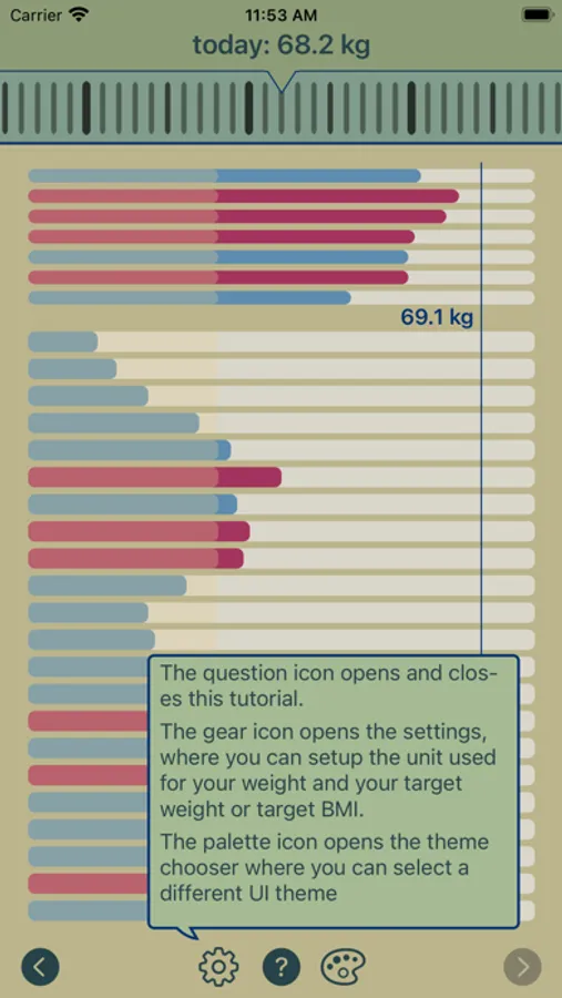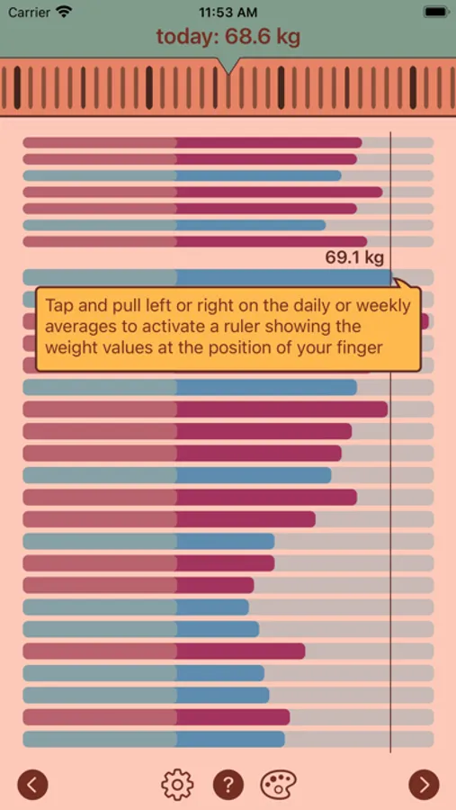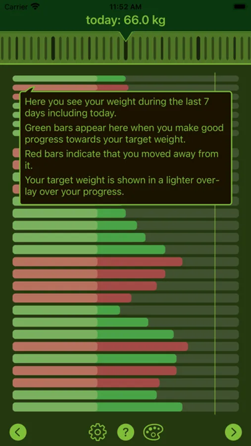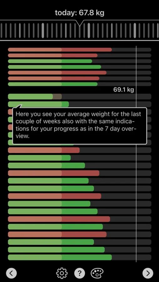 Record your weight daily and see at a glance how it changed during the last 7 days and the last couple of weeks.