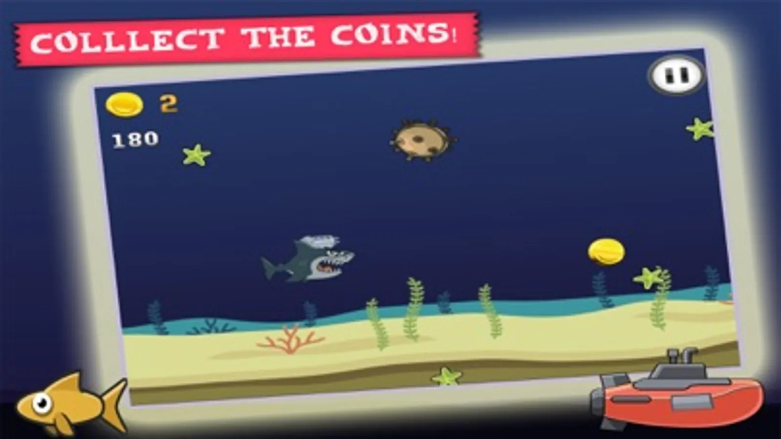 Simple controls make it easy to navigate your way throughout the deep ocean, whilst battling vs giant fish, mines and poisonous fish who are trying to stop you from collecting the treasure coins!