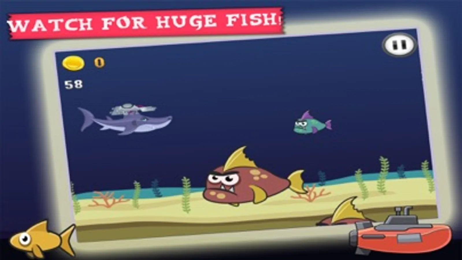 Submarine - This submarine is the king of the Ocean, it has a special cannon and is quick to move, be careful, it is quite large, so is difficult to dodge the Giant fish when using this submarine!
