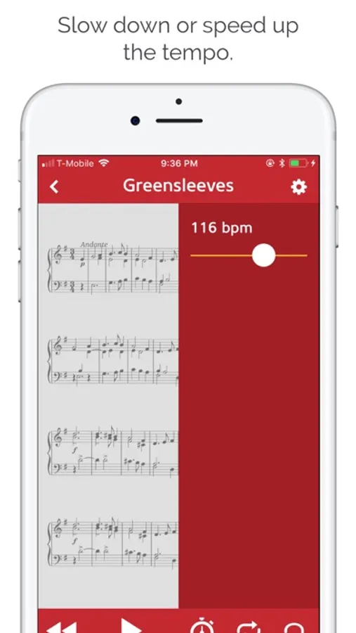• Tap music clefs to mute and unmute staves: hear the right hand part while playing the left hand part, and vice versa.