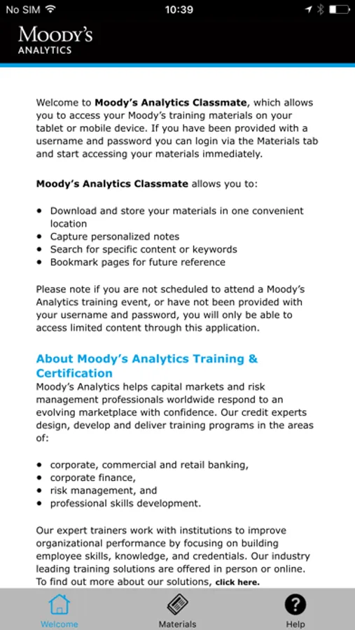 Moody’s Analytics Classmate is the mobile application which allows you to access your training materials on your tablet or mobile device.