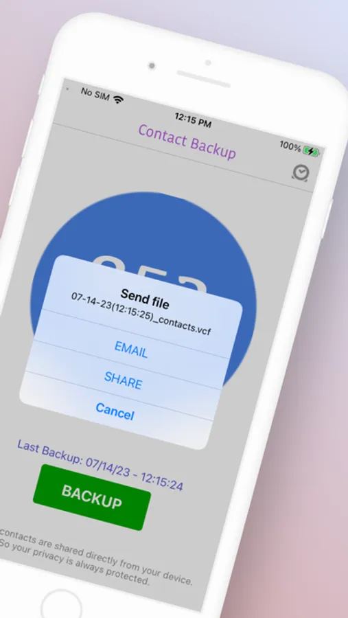 Easily and quickly backup your contacts with this app. Whether you are selling your mobile or purchasing a new handset you need to backup your contacts, this app makes this process easy by enabling you to send all your contacts and their related informations as vCard to your mail id. You can restore those contacts from the mail just by clicking on the vCard attachment and saving them.