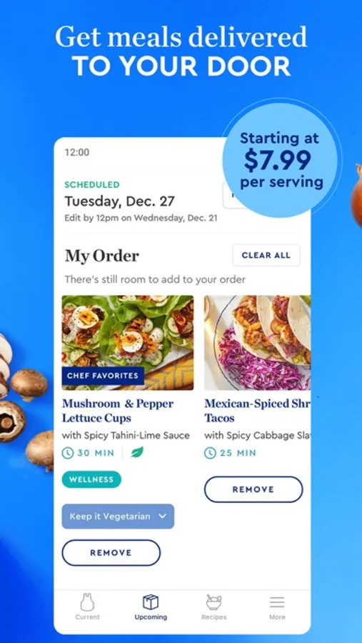 As the original American meal kit, Blue Apron delivers chef-crafted recipes with quality ingredients right to your door. With this app, you can choose meals on the go, manage your deliveries, rate recipes, and more. Enjoy having flexibility at your fingertips—customize select recipes, change your number of servings, or add more meals to your order. You can easily skip weeks when you need to.