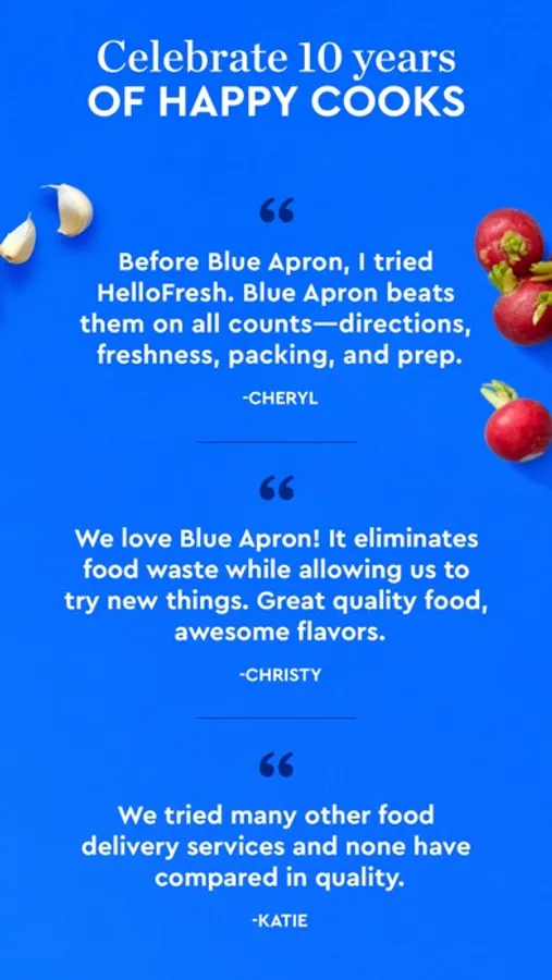 With Blue Apron, home cooking is easier than ever. Choose from 70+ weekly options for different lifestyles, including nutritionist-approved Wellness meals, Family Friendly recipes, and Heat & Eat meals ready in minutes.