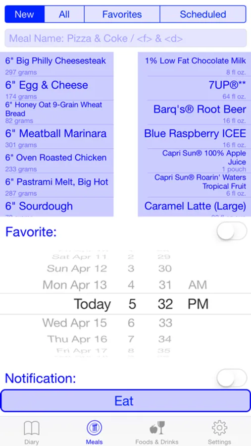 Add the foods and the drinks to create a meal which you can eat now or later with notification.