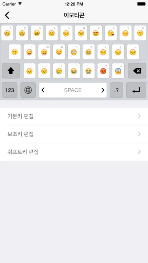 - Emoji 키보드 (추가 커스텀 키보드 구입 하신분은 사용가능 합니다, 지구본 버튼을 꾹 누르면 Emoji 아이콘 버튼이 나옵니다.)