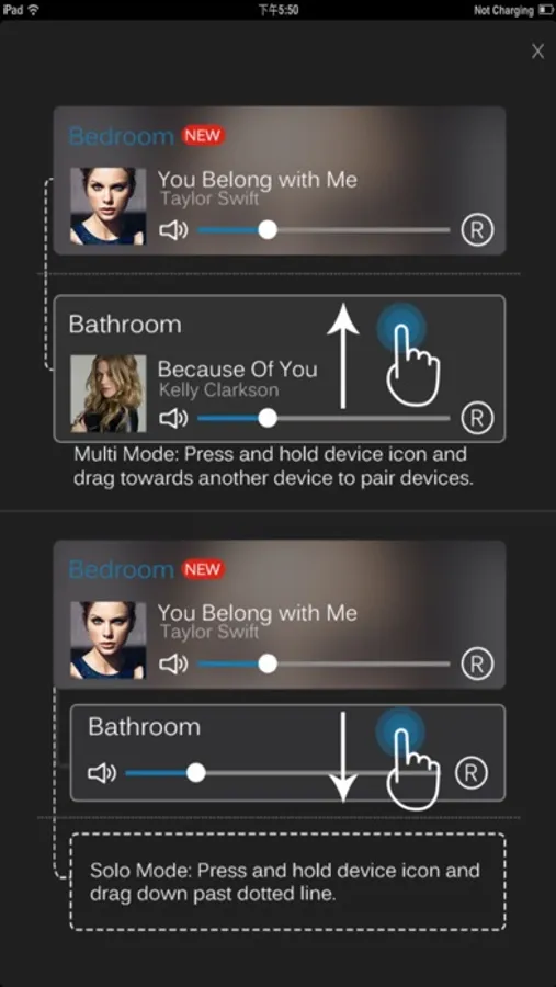 Create the desired atmosphere in different rooms by simple steps. Play different songs in separate rooms or even same songs in multiple rooms simultaneously.