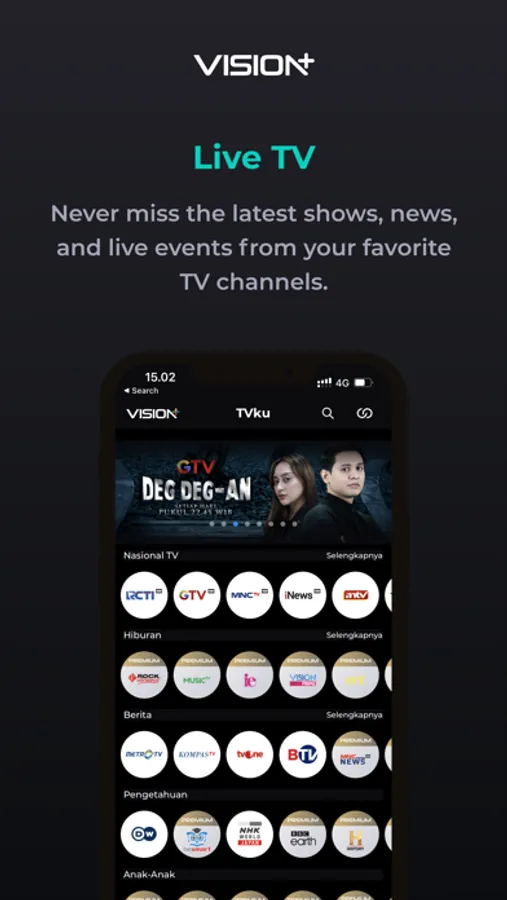 Vision+ provides full HD quality live channels from various national TV in Indonesia, such as RCTI, GTV, MNCTV, iNews, ANTV, Trans7, TVOne, Metro TV, NET TV, etc. And many International Channels such as HITS, TVN Movies, Celestial Movies, Thrill, Zee Bioskop, Nickelodeon, and many more.