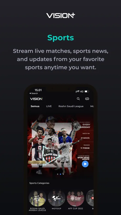 Stream exclusive live sports, and highlights, from football to Esports. We have Soccer Channel, MNC Sport, to SPOTV channels for well-known events such as MotoGP, Football, futsal, BWF Badminton, Wimbledon Tennis, WorldSBK, Formula E, Golf, SEA GAMES, Asian Games, and many more.