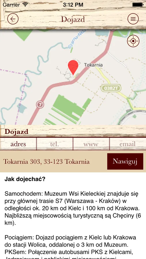 Dzięki zastosowanej technologii GPS użytkownik w każdej chwili może poznać swoją dokładną pozycję, znaleźć na mapie interesujący go obiekt i odnaleźć do niego najkrótszą drogę, którą aplikacja automatycznie wyznaczy. Poruszanie się po mapie znajdującej się w aplikacji urozmaica także ciekawa grafika, która prezentuje obiekty i cały obszar skansenu w sposób bardzo zbliżony do ich rzeczywistego wyglądu. Pomocna jest także opcja dojazdu, która doprowadzi użytkownika do Parku z dowolnego miejsca.