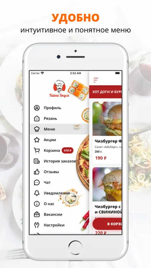 Приложение для доставки еды доставки еды Тайна Вкуса. Наш ассортимент: пицца, роллы, шашлык, суши, ВОК, бургеры, хот доги и многое другое в городах: Рязань