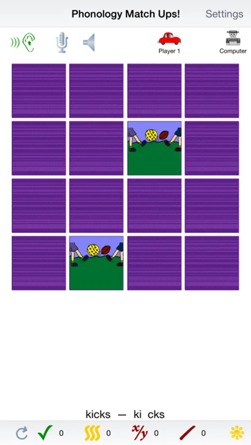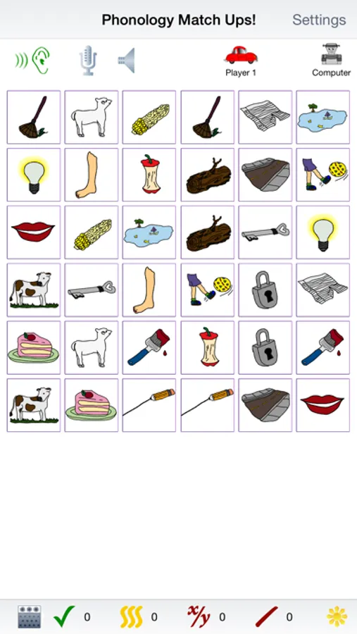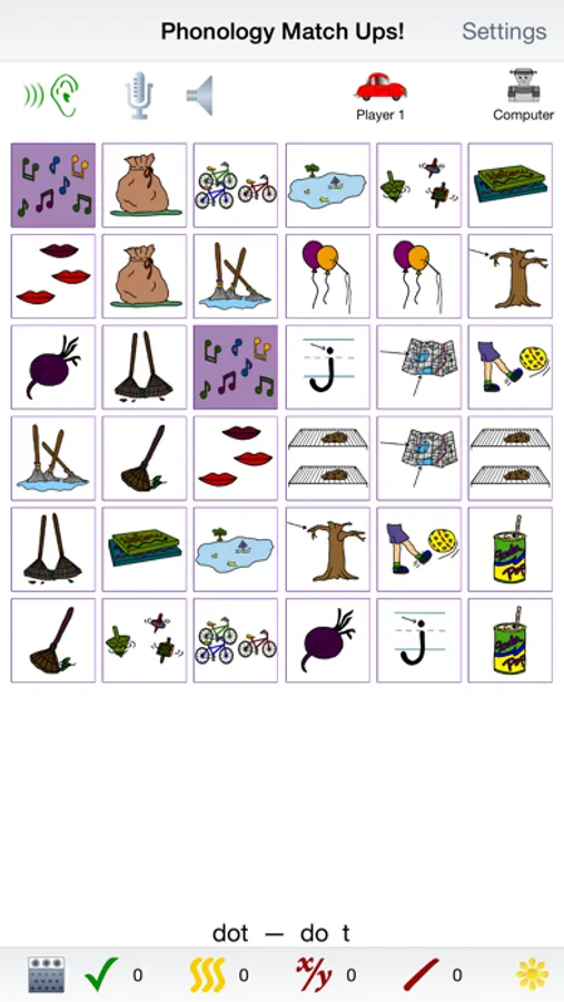 Match Ups! is one of our favorite games of all time. The first version of Match Ups! was added to our Attention and Memory:Volume I CD in 1996 and we’ve been enhancing it ever since. This version uses the words and pictures from our Phonology and Minimal Pairs apps.