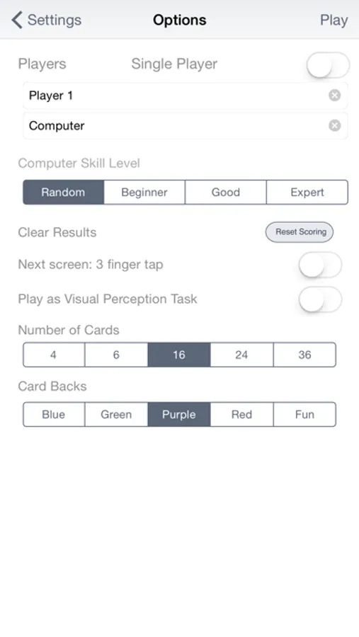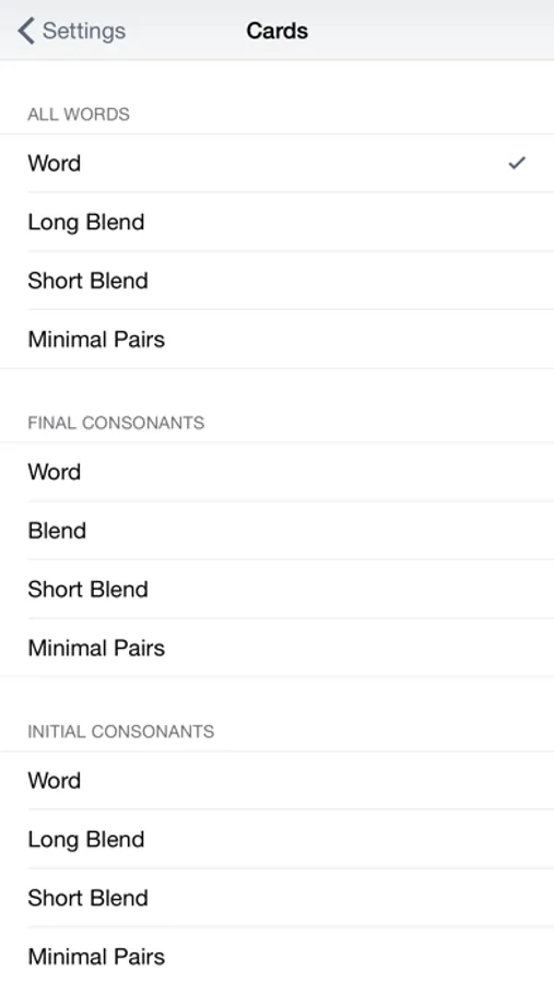 You can play with 4, 6, 16, 24, or 36 cards on the screen. The cards organized into four groups: Final Consonants, Initial Consonants, Initial S Clusters, and Initial L and R clusters. You can choose simple blue, green, purple, or red card backs or spice things up and choose fun backs.