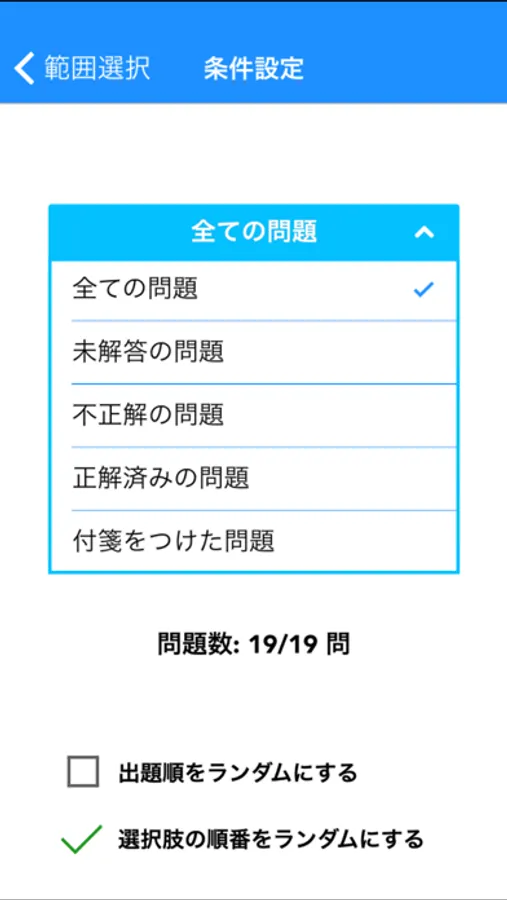 ・「すべての問題」「未回答の問題」「不正解の問題」「正解済みの問題」「付箋をつけた問題」