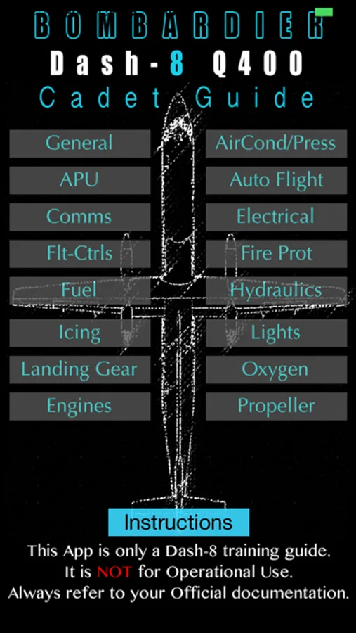 A technical guide for Pilots training and current on the Bombardier Dash-8 Q400 Aircraft. Various technical subjects covered as seen in screen-shots. It goes through the main points and so does not over-dose you with complete in-depth information. Its a great way to start your training/studies on the Dash-8 or even for a refresher course on technical subjects. This App is for study use only and NOT for operational use.