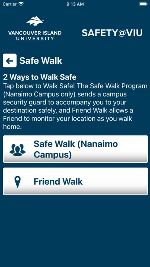 -Safe Walk – Request a Safe Walk from VIU security, or use the Friend Walk feature to have a friend monitor your walk home.
