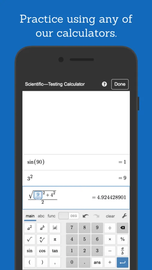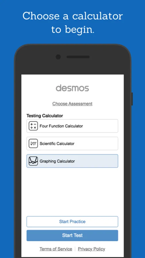 ** These are restricted versions of the Desmos Calculators that comply with exam requirements. To prepare for specific state or national assessments, select the corresponding test from the menu in the app. Find out whether Desmos is used for your test at www.desmos.com/testing.