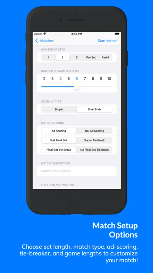 - Supports a variety of match lengths and rules including options for pro set matches, ad-scoring, final set tie breaks and super tie breaks.
