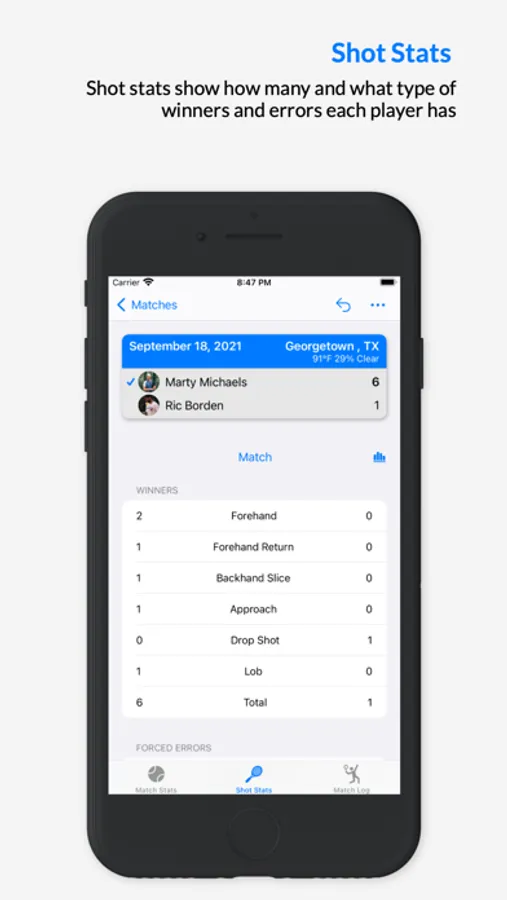 - Shot Stats takes it to the next level, letting you see the number of forehands, backhands, volleys, drop shots, and overheads hit for winners or as errors.