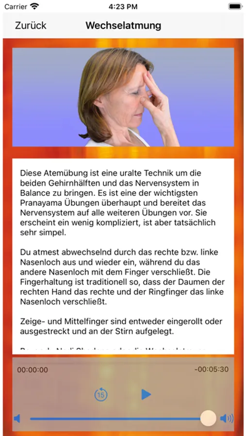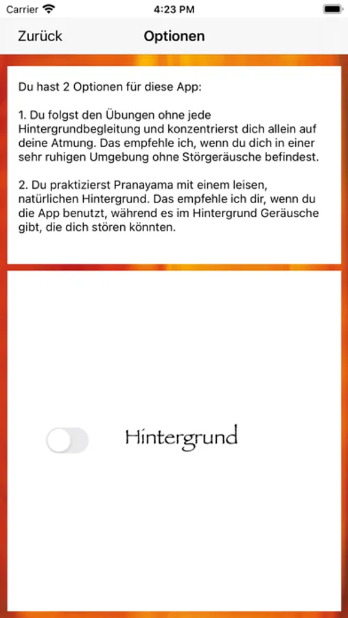 Richard führt Dich durch drei Übungen in dieser App: Spinal-, Wechsel- und Vollatmung. Du kannst wählen, um seine Übungen mit oder ohne Hintergrundgeräusche zu hören.