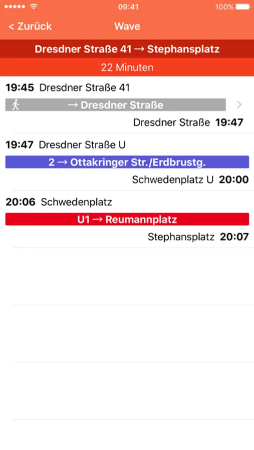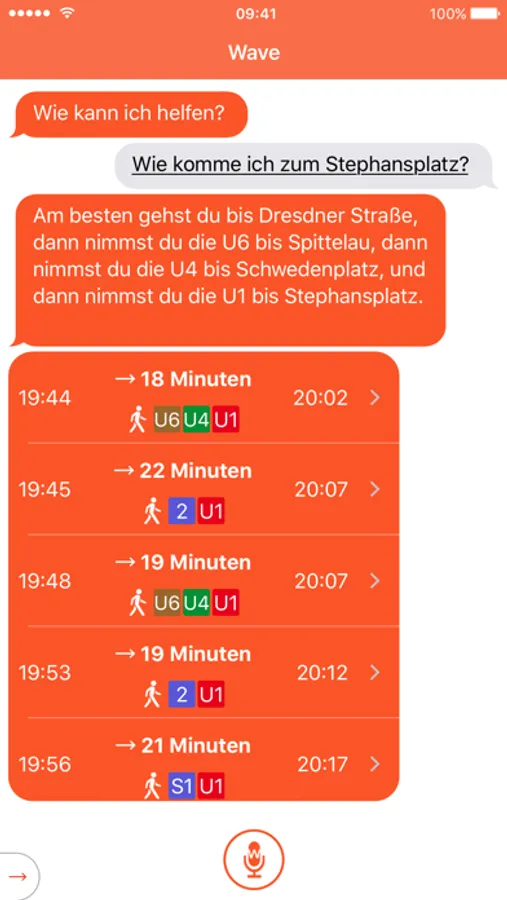 Sprich frei heraus! Wave funktioniert mit Spracherkennung, ohne dass du bestimmte Befehle auswendig lernen musst. Je mehr du mit Wave sprichst, desto besser versteht sie dich auch. Sag einfach "Wie komme ich zum Stephansplatz" oder "Wie lange brauche ich nach Hause" und Wave findet eine Öffi Route für dich.