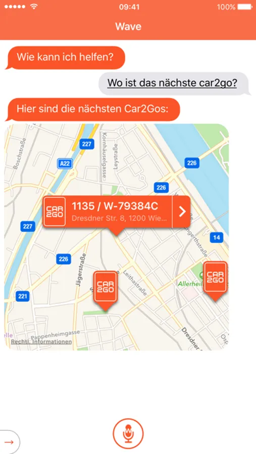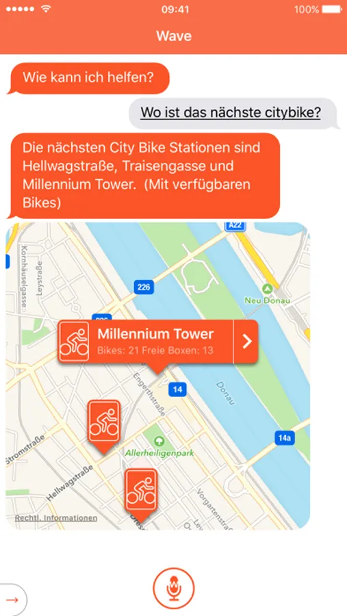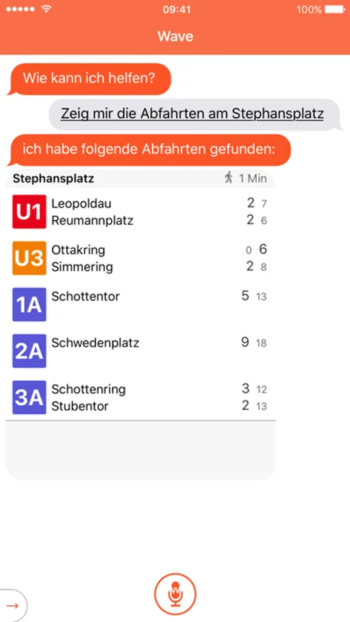 Sprich mit Wave und sie beantwortet dir all deine Wien-Fragen! Mit Wave hast du stets alle nützlichen Mobilitätsinformationen deiner Stadt zur Hand. Und das in Sekunden.