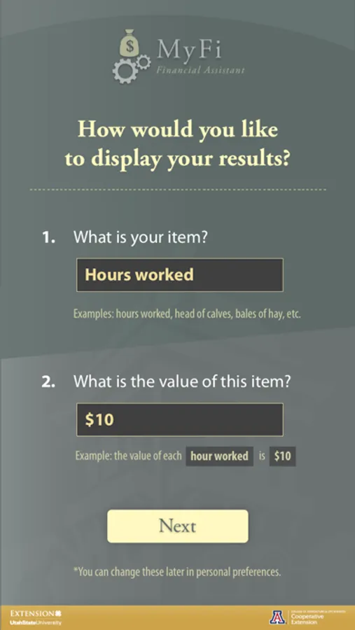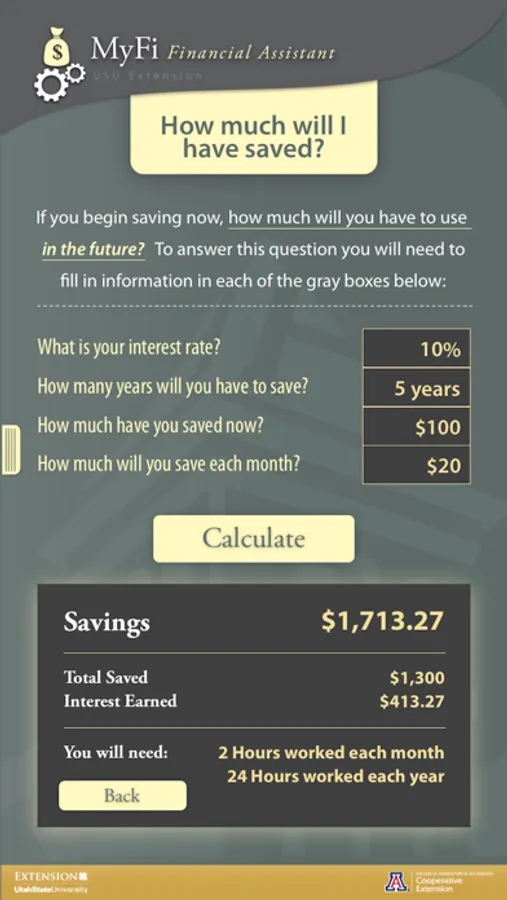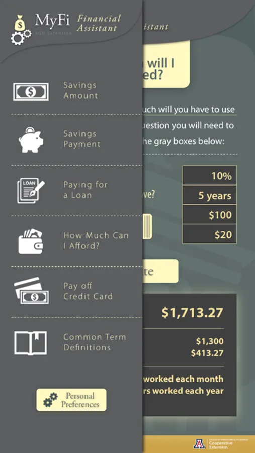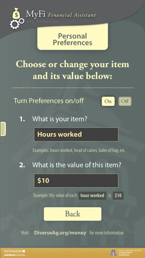 This app is designed to be a personal financial assistant providing the ability to examine common financial situations such as loans, credit card payments, and savings. The user can personalize the results by converting them into something meaningful to them such as hours worked, average amount spent on eating out or other items they might purchase or sale such as: head of calves, bales of hay, shoes, etc.