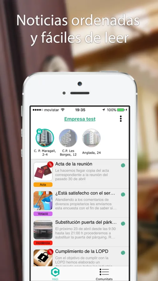 Ogeo®Community te muestra en una misma aplicación toda la información de las comunidades de las que formes parte. Podrás recibir avisos generales, comunes para toda la propiedad o personalizados sólo para ti. Sabrás quien y como se gestiona la comunidad, y te olvidarás de las incómodas notas en el buzón o los mails que dicen que han enviado pero que tú nunca recibes.