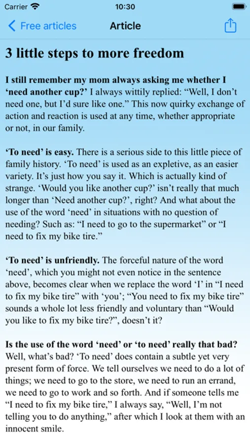 * Articles: the articles are about personal development in your private or work life. They contain practical information for better interaction with each other. Knowledge that will also come in handy if you want to get people to cooperate. If you want to be able to handle resistance better and to be able to develop your full potential.