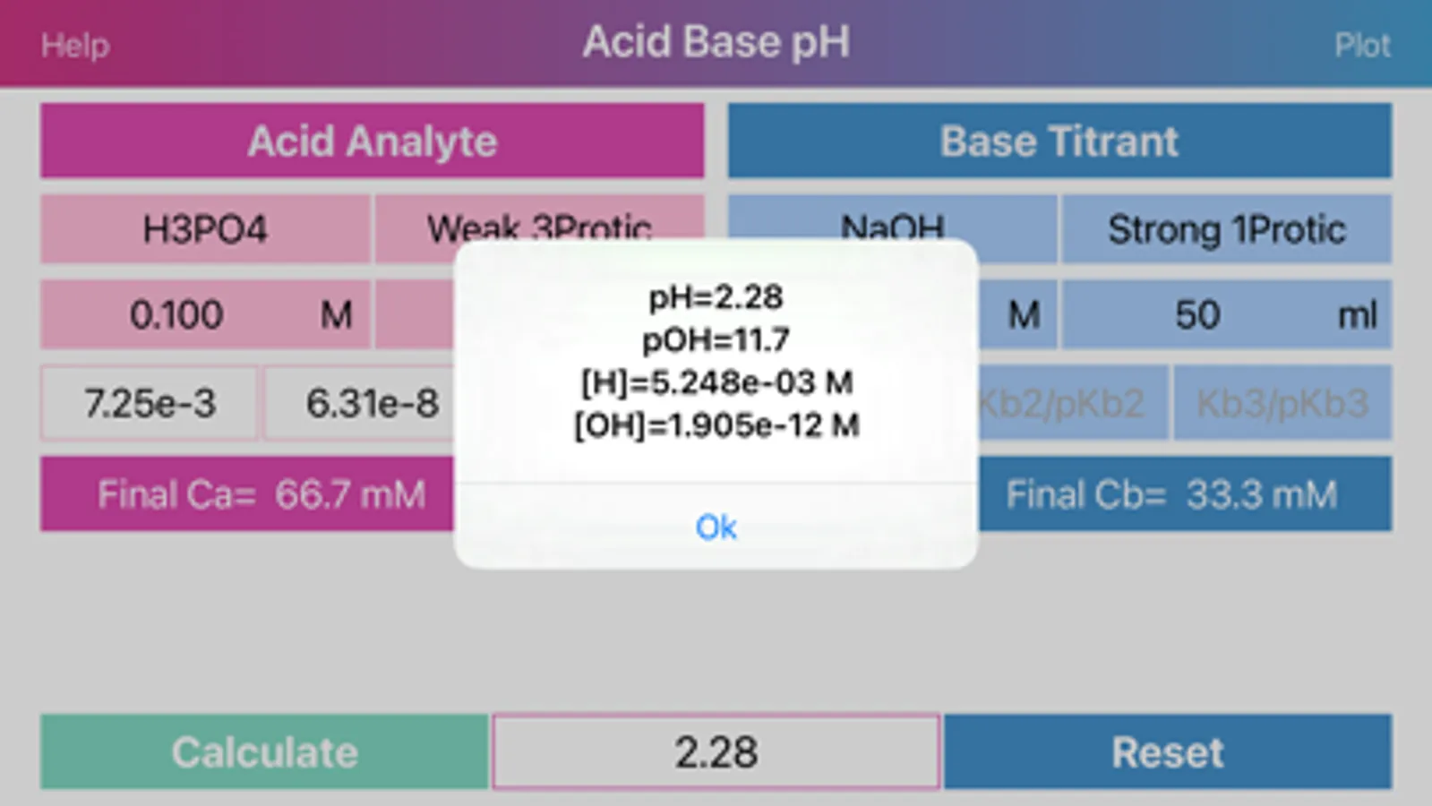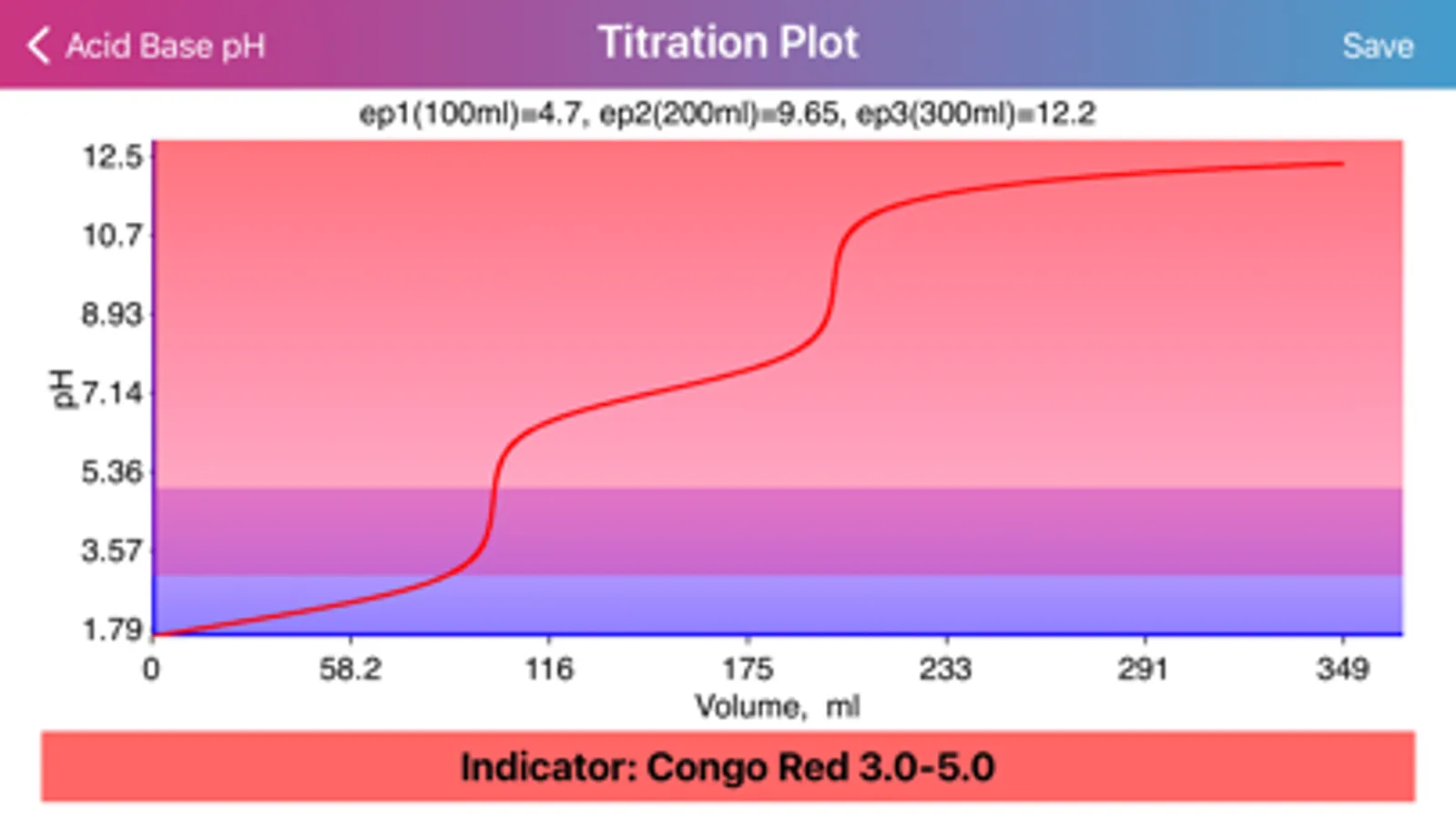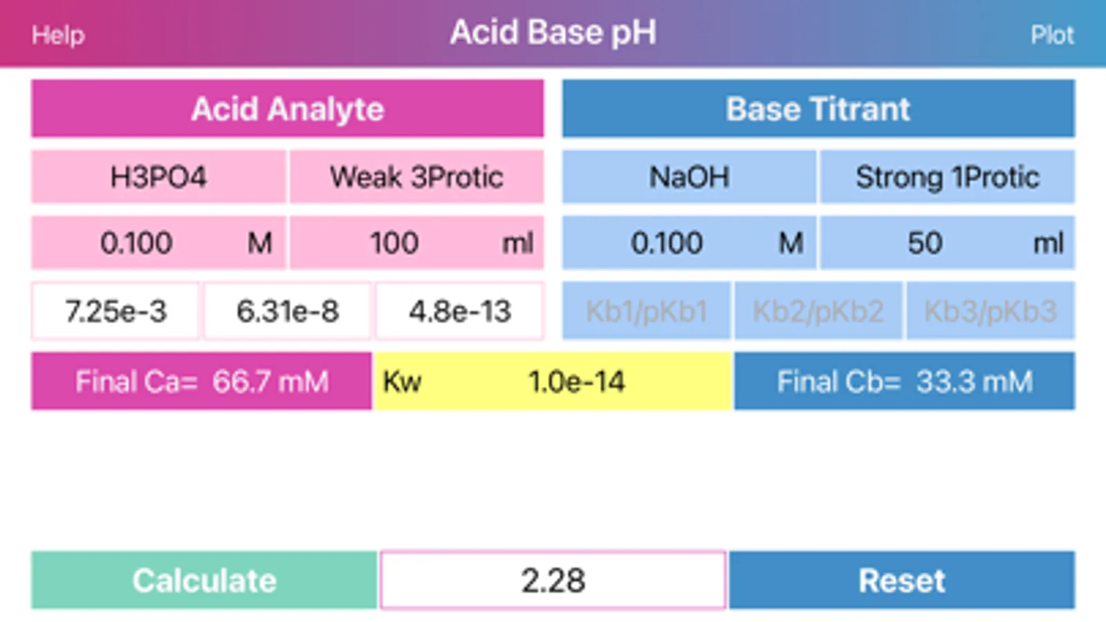 Acid Base pH is the ultimate tool for accurate estimation of pH values of acid – base aqueous systems. This application calculates pH values of solutions of weak and strong, monoprotic and polyprotic acids and bases and additionally builds titration curves and provides pH and titrant volume values at equivalent points.