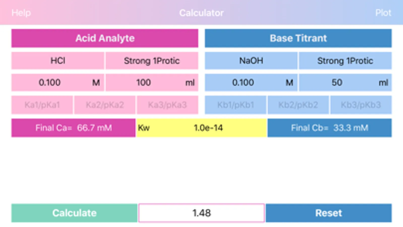 Layout of "Acid Base pH". Screen is divided by two sides: acidic (left) and basic (right), comprising of initial data of solutions, such as molar concentration, volume, proticity and equilibrium constants of first three dissociations. The upper, main field on each side allows to choose if the compound is titrant or analyte and the right field in the second row allows to choose proticity and weakness of acid or base. Important: Titrant compound, by default, can be only monoprotic and strong. When molar concentration of only one initial solution is provided (acid or base side), the application will estimate pH of the single solution. On the other hand, if both solution concentrations are provided, then application will be able to draw titration plot (“Plot” option in the navigation bar), based on titrant-analyte parameters as well as to provide pH and titrant volume values at equivalent points. Furthermore, the plot of titration curve can be exported as an image or as text worksheet. Additionally, it is possible to find titrant volume needed to achieve desired pH value, by entering the pH value to the corresponding field and pressing “Calculate” button.