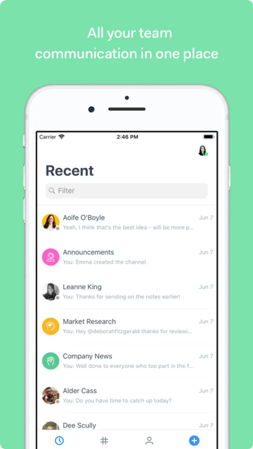 Chat channels: Communicate with your team in channels for your department, team, project, client – or whatever grouping is relevant to your business.