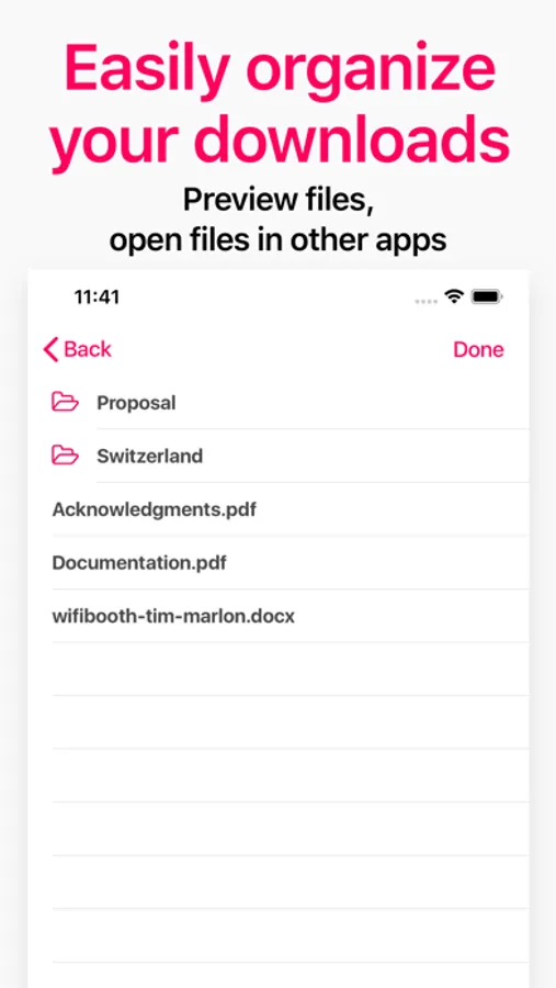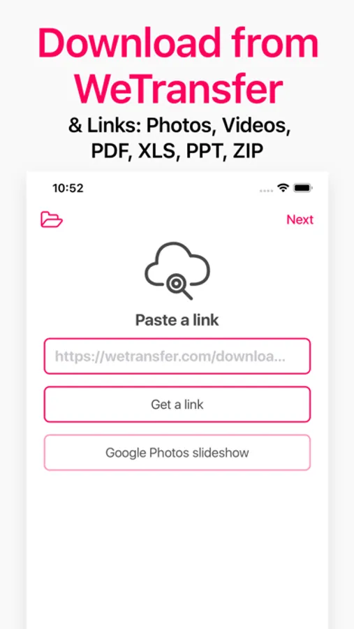 WeDownload downloads *WeTransfer* & ZIP files, and saves the photos, videos, PDFs, and documents they contain. Photos & videos are saved in the Camera Roll. Documents including PDF, DOC, XLS, PPT can be viewed directly in the app. Paste in a WeTransfer or any http(s) link, and you're done.