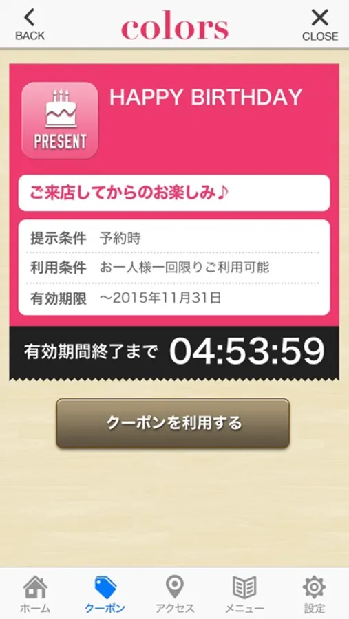 このアプリでは、ネイルサロン「colors」の色々な情報やアプリユーザー限定のお得なサービスが手に入ります!