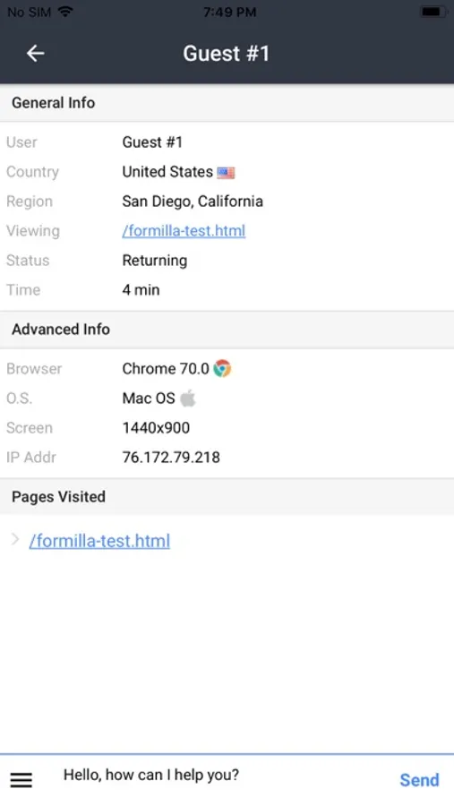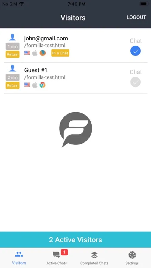 Real-time Visitor Monitoring: The Formilla Live Chat app will automatically display and update the number of active visitors currently on your website right on your iPhone or iPad. Initiate live chats with users, see what web pages they have visited, the referring site URL, whether they're a new or returning user, etc. Formilla Live Chat visitor monitoring comes with any of our Premium account packages.
