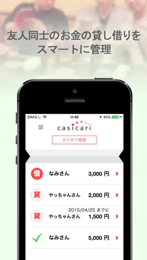 casicari(カシカリ)は友人同士のお金の貸し借りを管理してくれるアプリです。