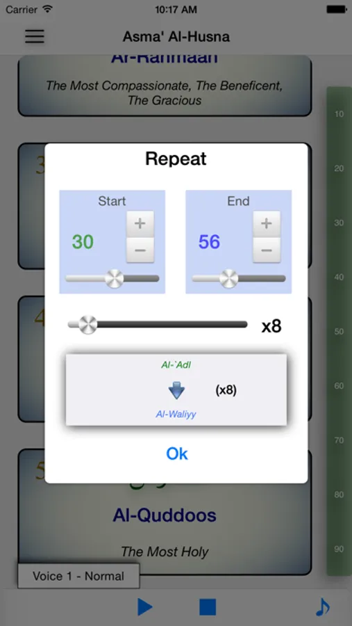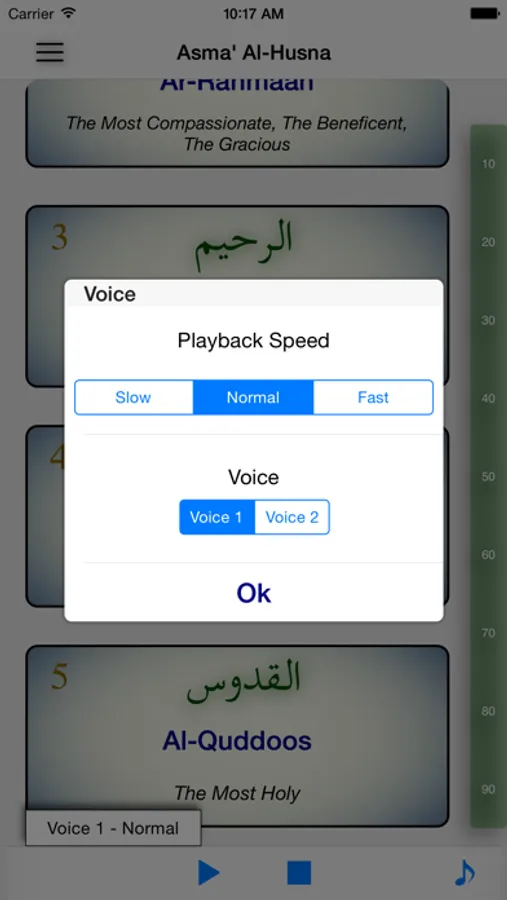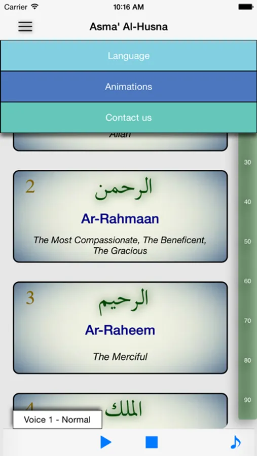 With this app you'll learn the 99 Names of Allah (Asma' Allahul Husna - اسماء الله الحسنى).