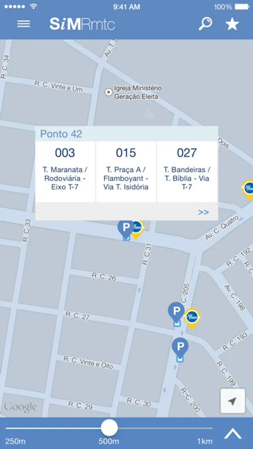 Ao clicar no ponto desejado aparecem os horários dos dois próximos veículos por linha que passarão por ali.