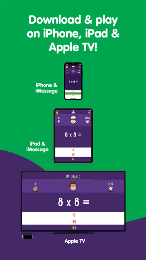 We understand that everyone’s different and while multiplication times tables can be daunting for kids, Ibbleobble lets your child learn at their own pace, or take a challenge against the clock! We use a familiar multiple choice method designed with little hands in mind. We’ve also made this app available on all your devices with one single purchase. This way children can play and learn on the go with their iPhone, iPod or iPad whilst also on the big screen of the Apple TV!