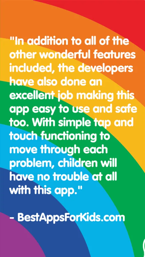 "In addition to all of the other wonderful features included, the developers have also done an excellent job making this app easy to use and safe too. With simple tap and touch functioning to move through each problem, children will have no trouble at all with this app. As a parent it is also nice to see that there are no advertisements or other distracting links to worry about."