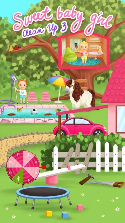 Sweet Baby Girl Dream House is a mess! Dirty dishes in the kitchen, unwashed clothes, broken fence, messy pony stables, dirty swimming pool, sticky floor, dusty tables and much more things need someone to take care of them. Time to clean up and make the Dream House look neat and pretty again!