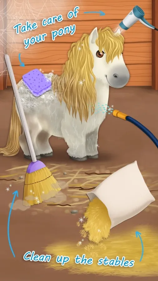 - Make Sweet Baby Girl‘s pet pony happy: clean up PONY STABLES and groom her little pony!