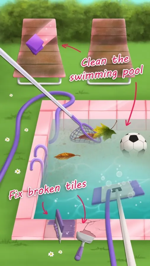 - Clean the SWIMMING POOL: skim tree leaves with a net, clean the water with pool vacuum and fix the broken tiles!
