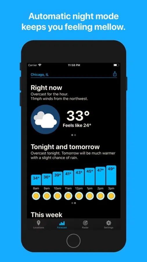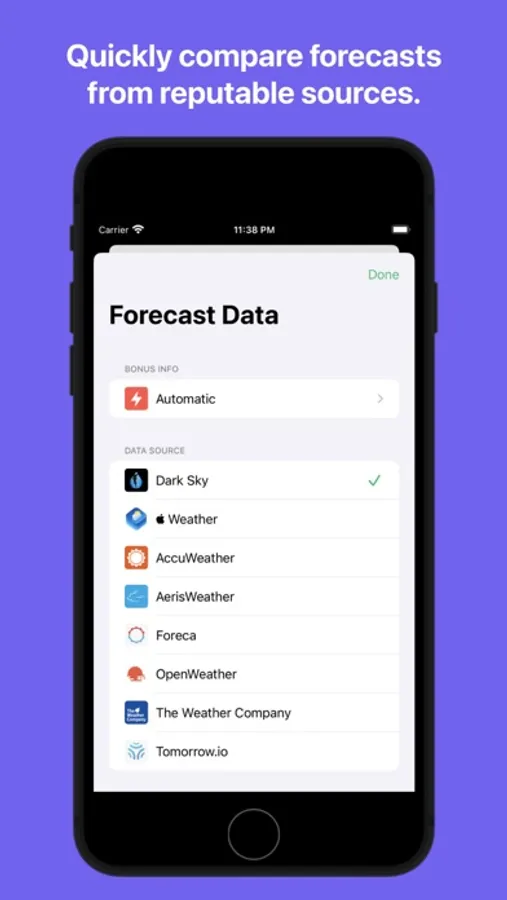 Hello Weather is more than a pretty face. It’s powered by the world’s best data sources, like Apple Weather, AccuWeather, Foreca, The Weather Company, and Tomorrow.io. Pick the provider that's best in your area, or switch back and forth to compare. (Upgrade required.)