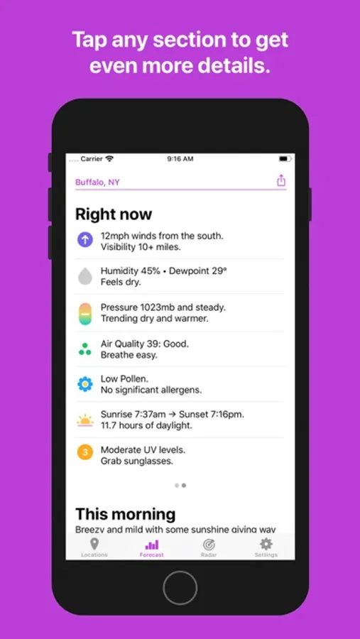 Our gorgeous, information-rich design shows you everything that matters in one simple screen. You’ll see the current conditions and future forecast in an instant.