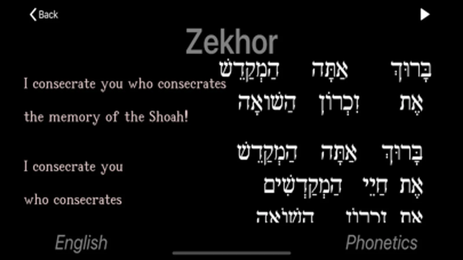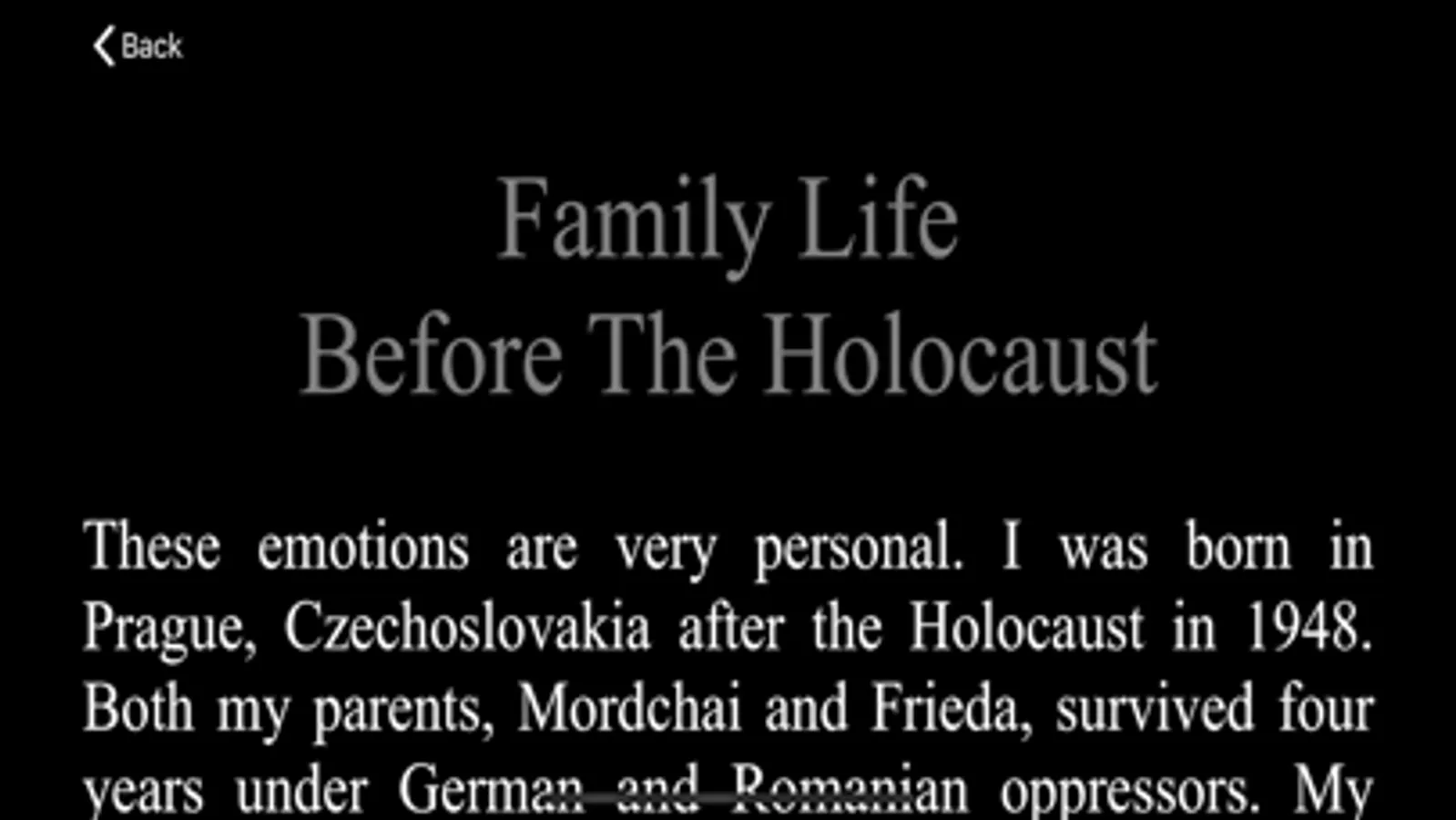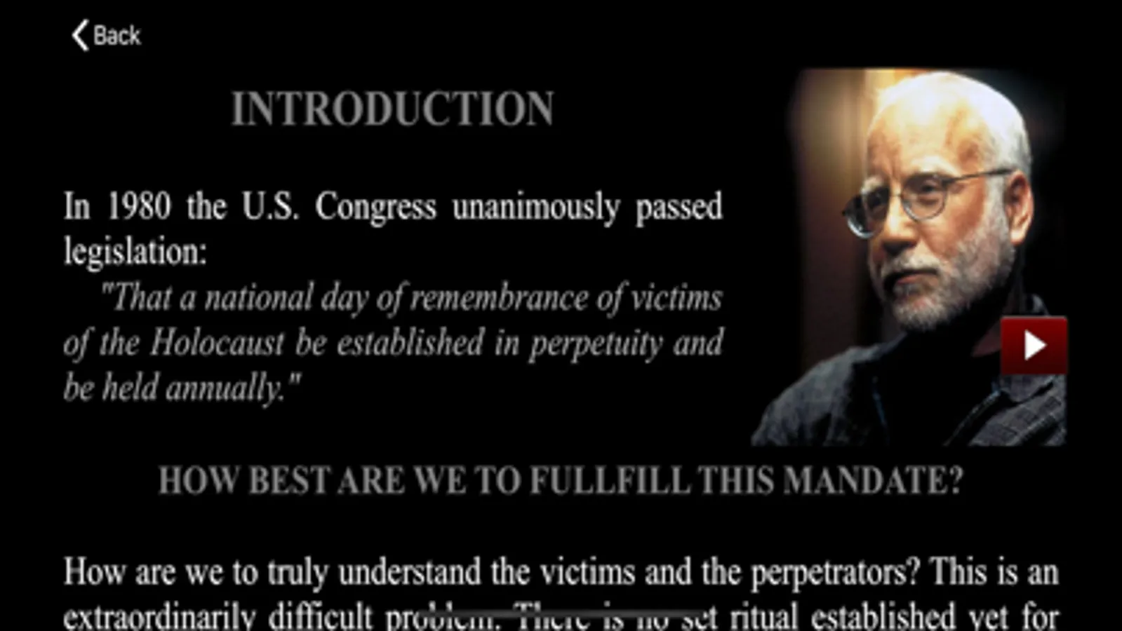 Additional app elements include Rabbi/Dr. Moshe Shualy reflecting on life before the Shoah by telling his own personal story as a child of Holocaust survivors. Cantor Emanuel Perlman chants the Memorial Prayer, which he delivered at the United States Capitol Rotunda for the National Day of Remembrance for liberators and Holocaust Survivors. Links are provided to take you to the United States Holocaust Memorial Museum as well as the Berlin Holocaust Memorial.