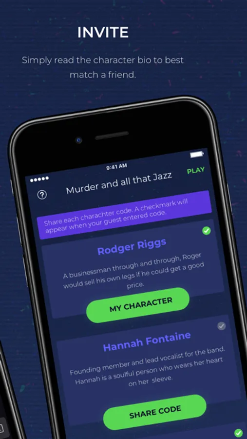 Gather a group of friends (7-21) and decide on a murder mystery and download it to your device. Set a place, date and time for the murder mystery dinner party. You’ll need about two or three hours. Once you finish entering details, you'll need to go through each character and share the code with your friends. Prepare for your role! Read the information about your character to understand their motivation and why they might be the murderer. Get your costume together, some suggestions included in the app. Finally, show up at the location everyone agreed to. The host will unlock "Introduction" to get the party started.