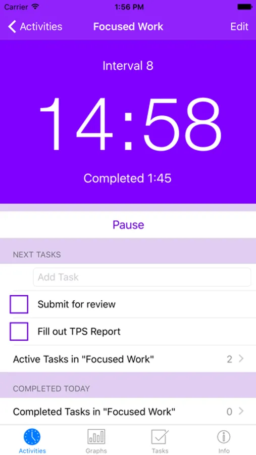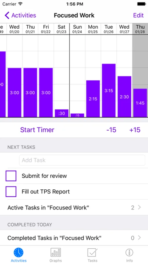 • Built-in focus timer: Use the activity timer to track short intervals (10 to 15 minutes) of focused effort. The timer is usually set to repeat, so that after each interval, you can keep going and stay “in the zone”, or stop and take a break.