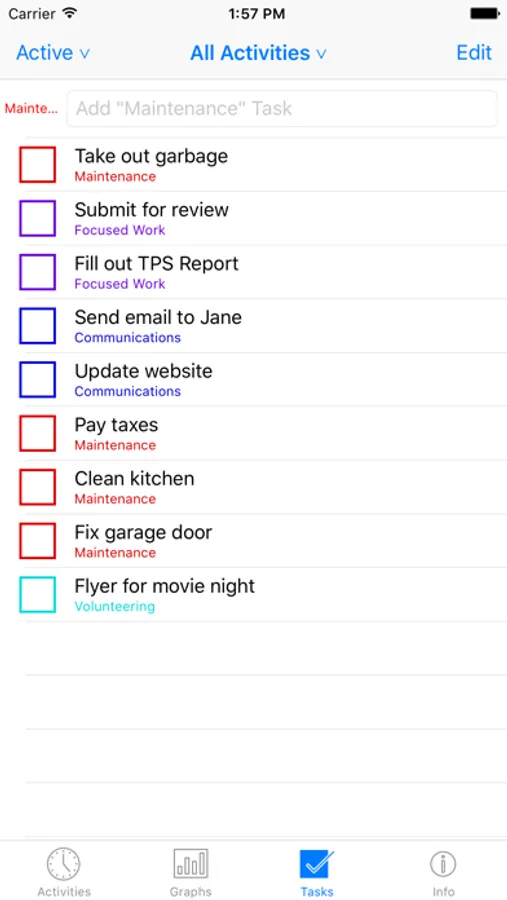 • Activities can be anything: work projects, habits, exercise, time spent answering email. Daypractice gives you some ideas to get started, but what you do is up to you.