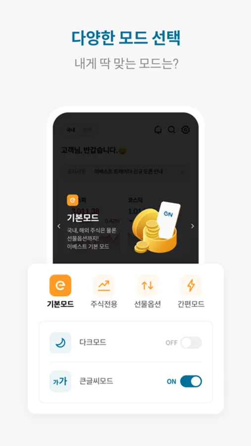 1. 기본모드, 주식전용, 선물옵션전용, 간편모드 등 나에게 맞는 ‘모드 선택’ 옵션 제공